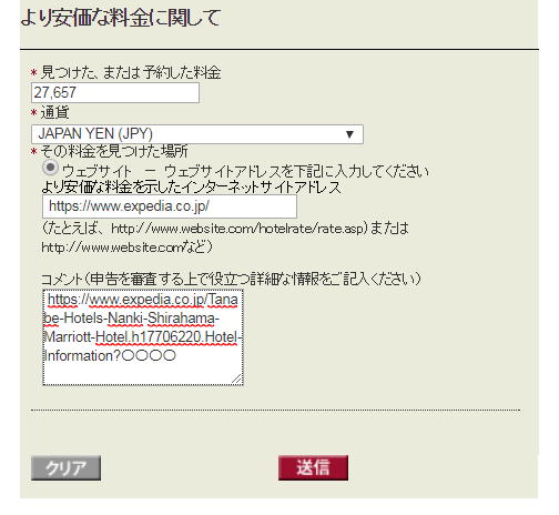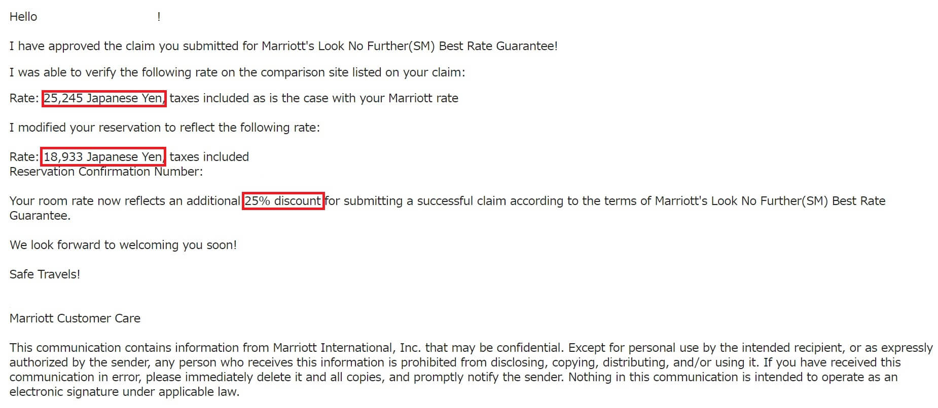 リクエストの処理時に比較対象料金の利用可能性を独自に確認できない場合、マリオットはリクエストを承認しない権利を有します。料金の比較対象オファーのスクリーンショットは、リクエストされた料金の比較確認処理の際に参考として使用されますが、比較対象オファーの証明とはなりません。