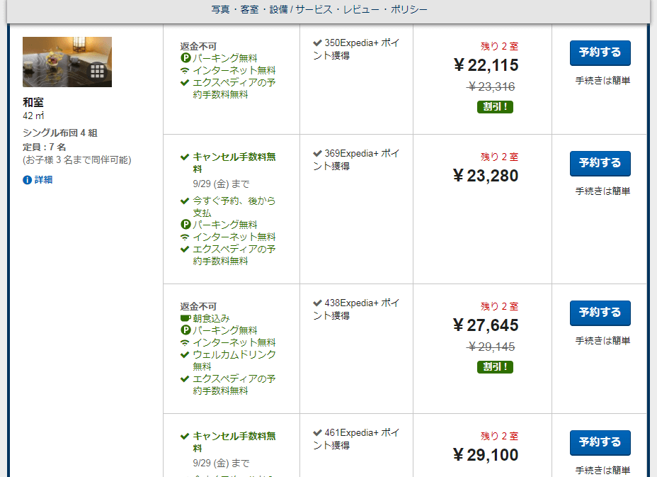 部屋タイプ(ランクだけでなく1ベッドか2ベッドかも同じである必要があります)