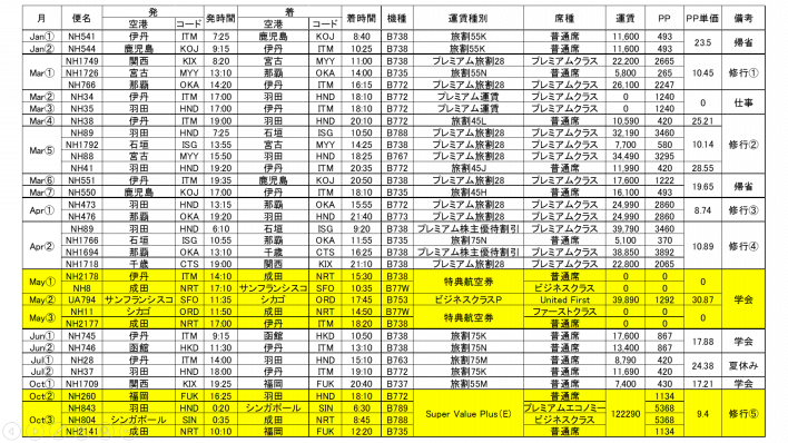 それではSFC修行解脱までに搭乗した便、費用やPP単価の一覧をお出しします
