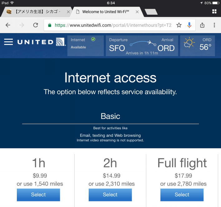 ちなみに機内Wi-Fiのお値段は以下の通りです。1時間プラン9.99ドル支払いました。ANAのWi-Fiよりは快適でした。しかしJALの機内Wi-Fi無料っていうのはすごいサービスですよね!