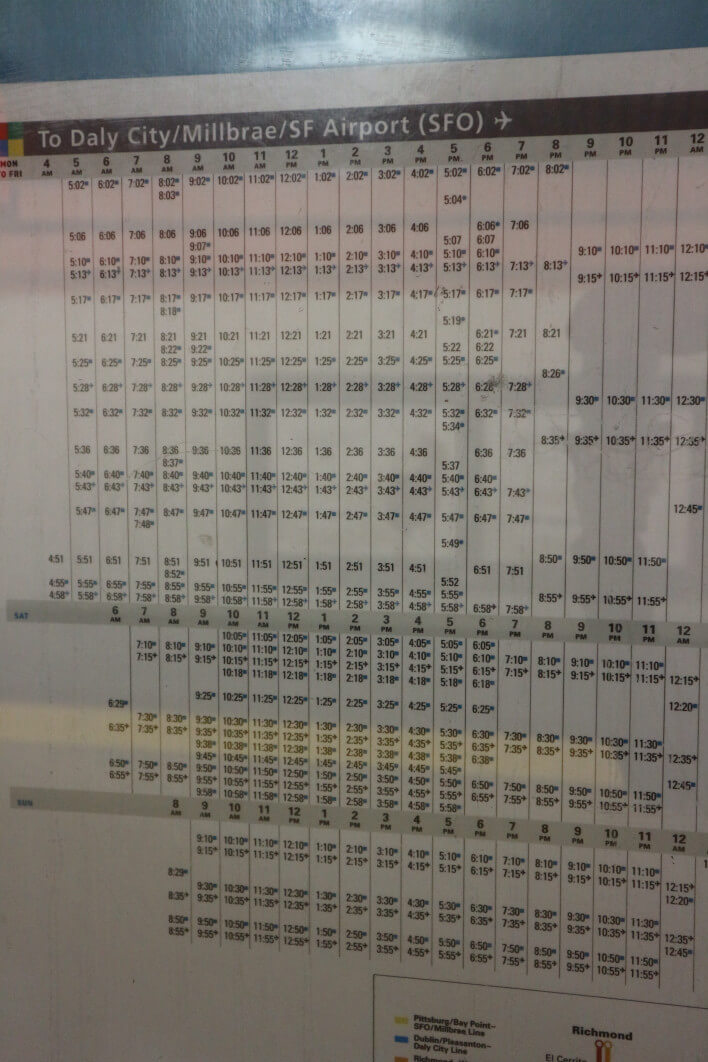 そして休日は空港行きのBARTは便が少なくて驚きました。休日朝に空港に向かう場合は注意が必要です。下の写真の一番下の段が日曜日の時刻表ですが8時台からしかダウンタウン発がない上に時刻表もスカスカです…