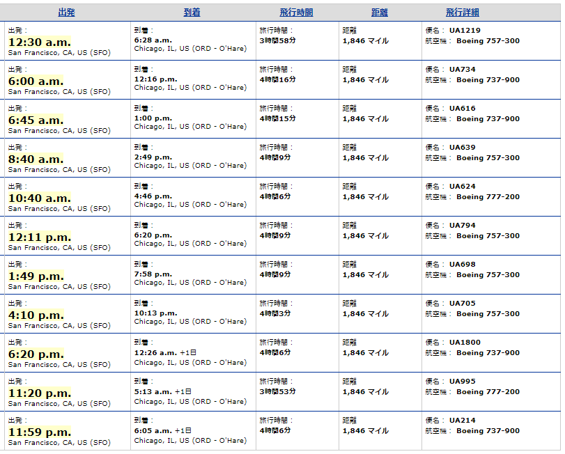 サンフランシスコ→シカゴのユナイテッド航空の便は実に多彩な時間帯に飛んでいます。僕が乗った時期の時刻表を保存していなかったので下にお示しするのは現在の時刻表ですがだいたい同じような時間でした。