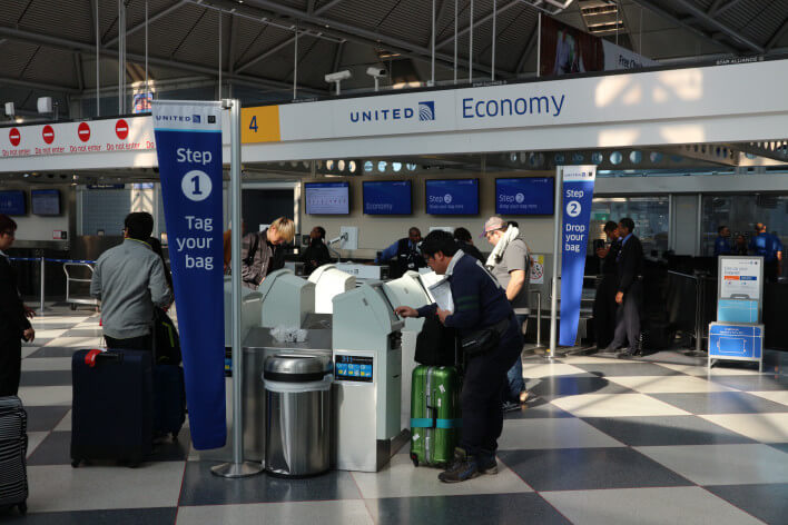 チェックインは自動チェックイン機を使います。これだけなら日本の国内線のJALやANAと同じですがこちらのチェックイン機では受託手荷物の計量も自分で行い、出てくるタグを自分でつける必要があります。