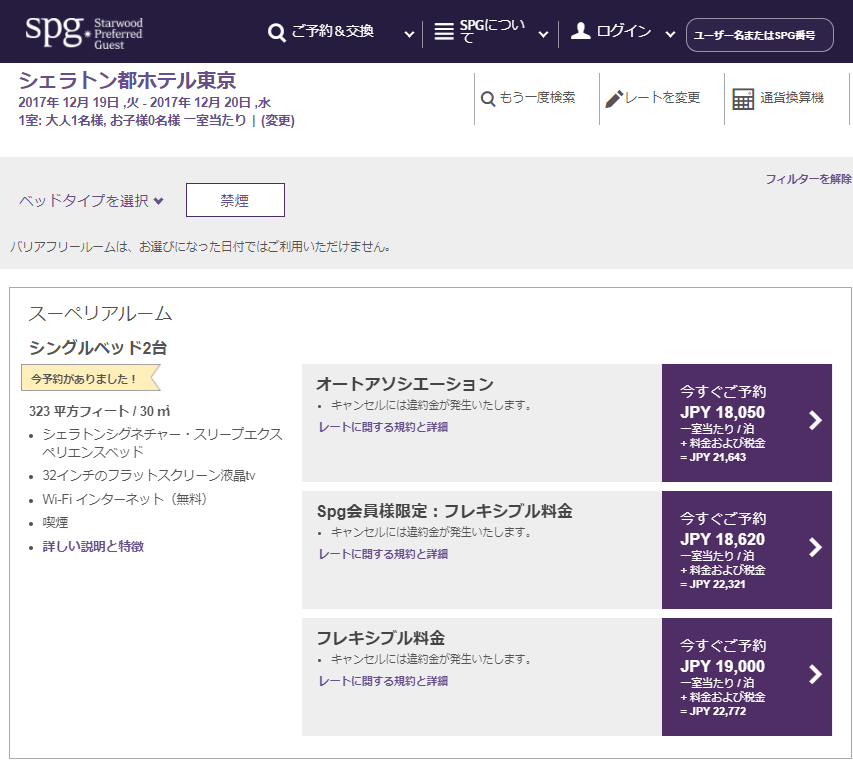 AAA料金である「オートアソシエーション」が18050円、SPG会員料金が18620円です。何とAAA料金の方が安くなっています。これは直近になっているためAAA料金もキャンセル料がかかりますし、直近のためSPG会員前払い料金がないからかもしれません。