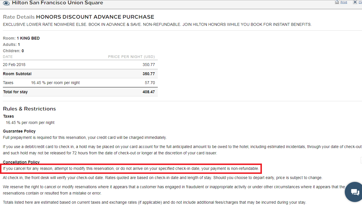 Honors Discount Advance Purchaseはキャンセル不可料金です
