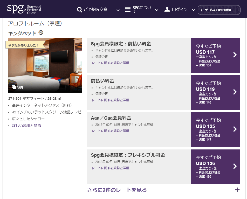 アロフトルームでSPG会員は117ドル、AAA料金は125ドルです。こちらもSPG会員Rateはキャンセル不可、AAA Rateは2日前までキャンセル可能です。