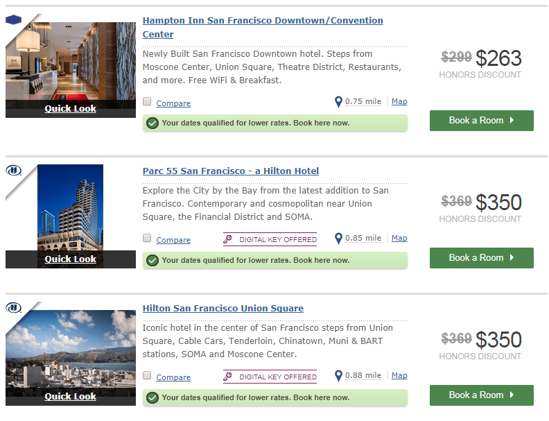 以上のように出ました。宿泊を検討したことのあるHilton San Francisco Union Squareが相場が分かりやすいのでこちらで比較してみます。