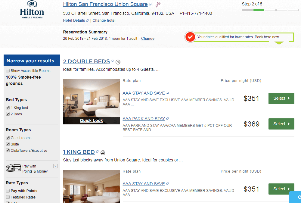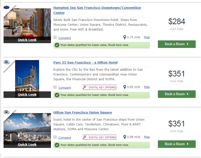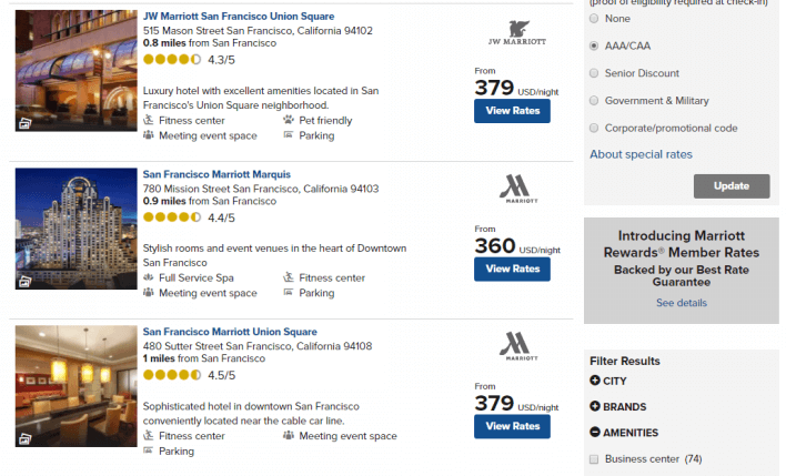 次にAAA Rateで同一日(2018年2月20日から1泊)でサンフランシスコのホテルを検索してみます。