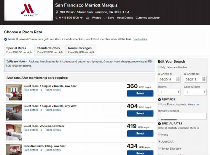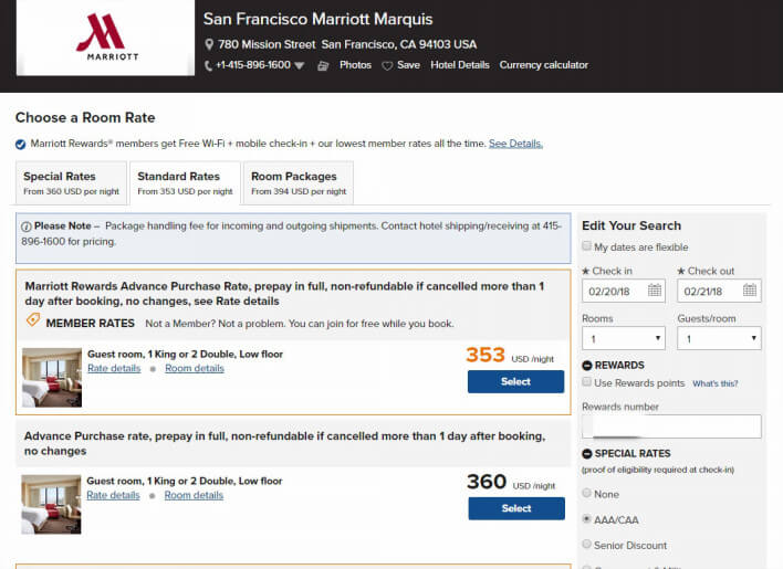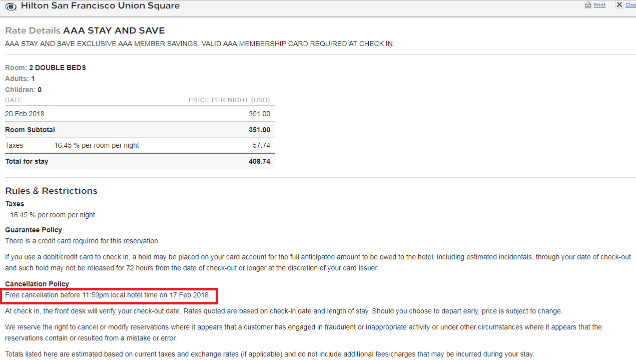 Marriott会員Rateの方が7ドル安いですが、Hiltonの場合と同様Marriott会員Rateはキャンセル不可、AAA Rateはキャンセル可能です。