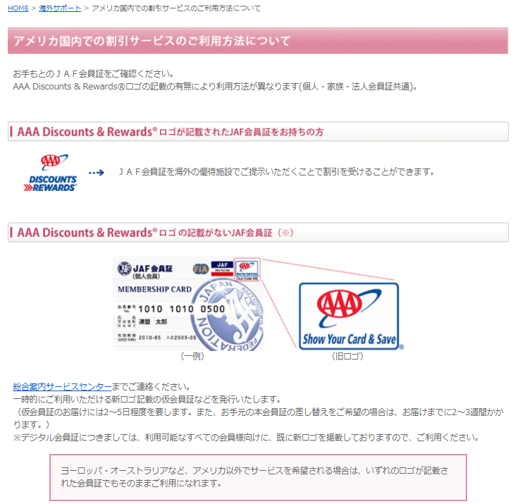 JAFはアメリカのJAFのような組織であるAAA(American Automobiles Association)と提携しています。ですのでAAA会員向けの割引が適用されます。僕も知らなかったのですが以下の画像のようにJAFの会員証の上にはAAAのマークがついています。会員証をお持ちの方は一度見て下さい!