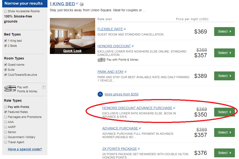 1 King Bed room で「Honors Discount Advance Purchase」料金が350ドルと最も安いようです。