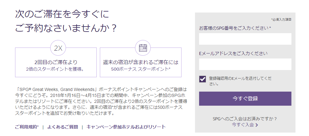 ご登録:スターウッド プリファード ゲスト(Starwood Preferred Guest®)会員様は、2018年3月31日(米国東部時間(ET)の午後11時59分)までにspg.com/greatweeksjpにてオンライン登録を完了していただく必要がございます。当キャンペーンにご登録済みの会員様は、キャンペーン参加SPG®ホテルおよびリゾートにて2018年1月16日~2018年4月15日まで(以下、「特典獲得期間」)の期間中、対象となるご滞在をされる度にボーナス スターポイント(Starpoints®)を獲得いただけます。
