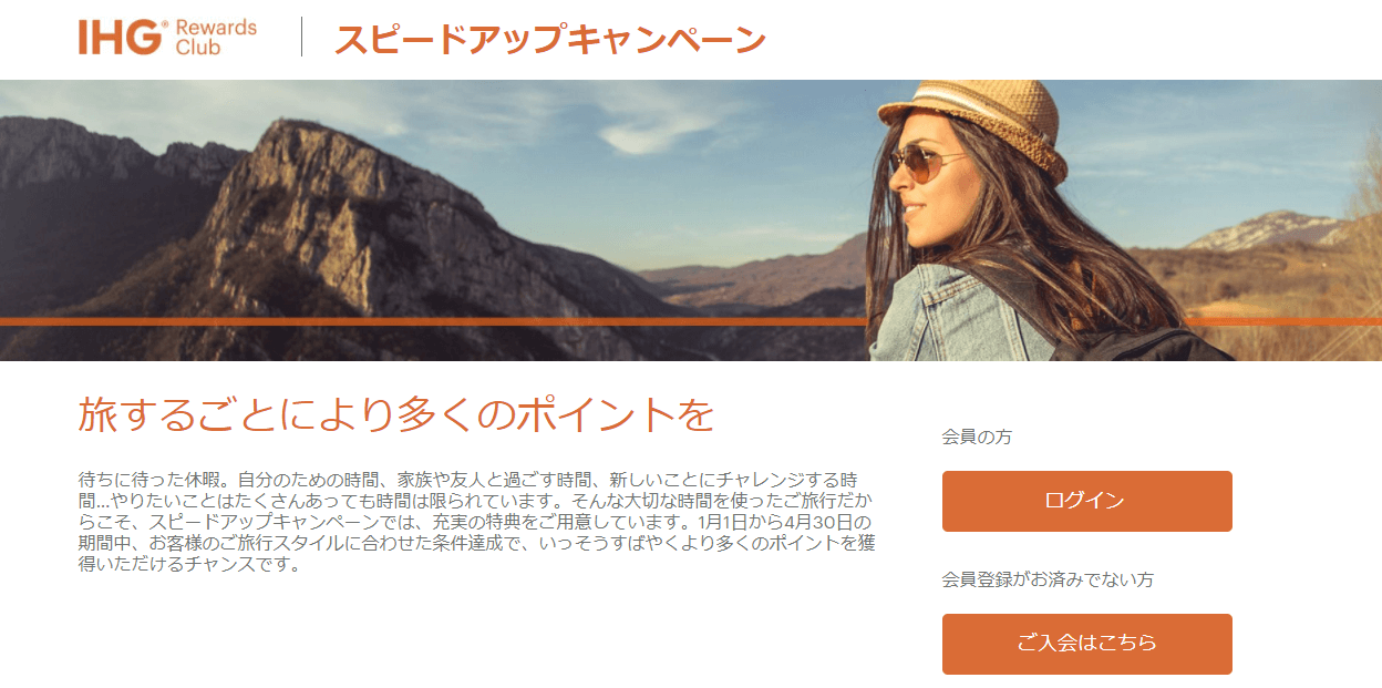 「スピードアップキャンペーン」(以下「本キャンペーン」)は、IHG®リワーズクラブ会員の方を対象としています。また会員の方が本キャンペーンをご利用いただくためには事前のキャンペーン登録が必要です。キャンペーン登録 (以下に定義されているとおり)をされた会員の方には、本キャンペーンのキャンペーン特典が提示され、提示された全キャンペーン特典の要件を満たすことで30,000ポイント以上のボーナスポイントの獲得機会を得ることができます。会員の方が「ワンクリック登録」をクリックした場合「スピードアップキャンペーン」へのキャンペーン登録およびIHG®リワーズクラブからのご案内の受取りについて、またキャンペーンのご利用規約やプライバシーに関する方針について同意されたものとみなします。会員の方が各キャンペーン特典(以下「特典」)の要件を満たした場合、各特典に提示されているボーナスポイントを獲得することができます。各特典は2018年1月1日~2018年4月30日(両期日を含む)の期間中に達成する必要があります(以下「登録」)。