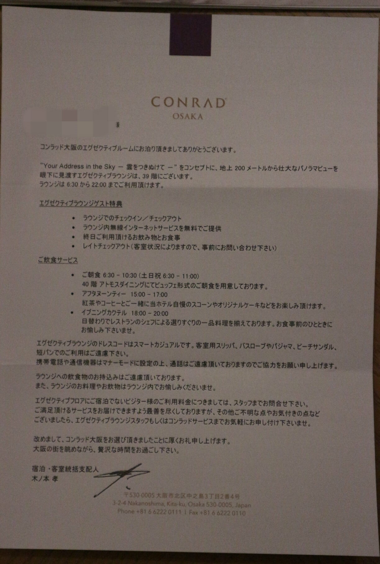 今回コンラッド大阪に宿泊してきました。国内外含めて初めてのコンラッド宿泊です。