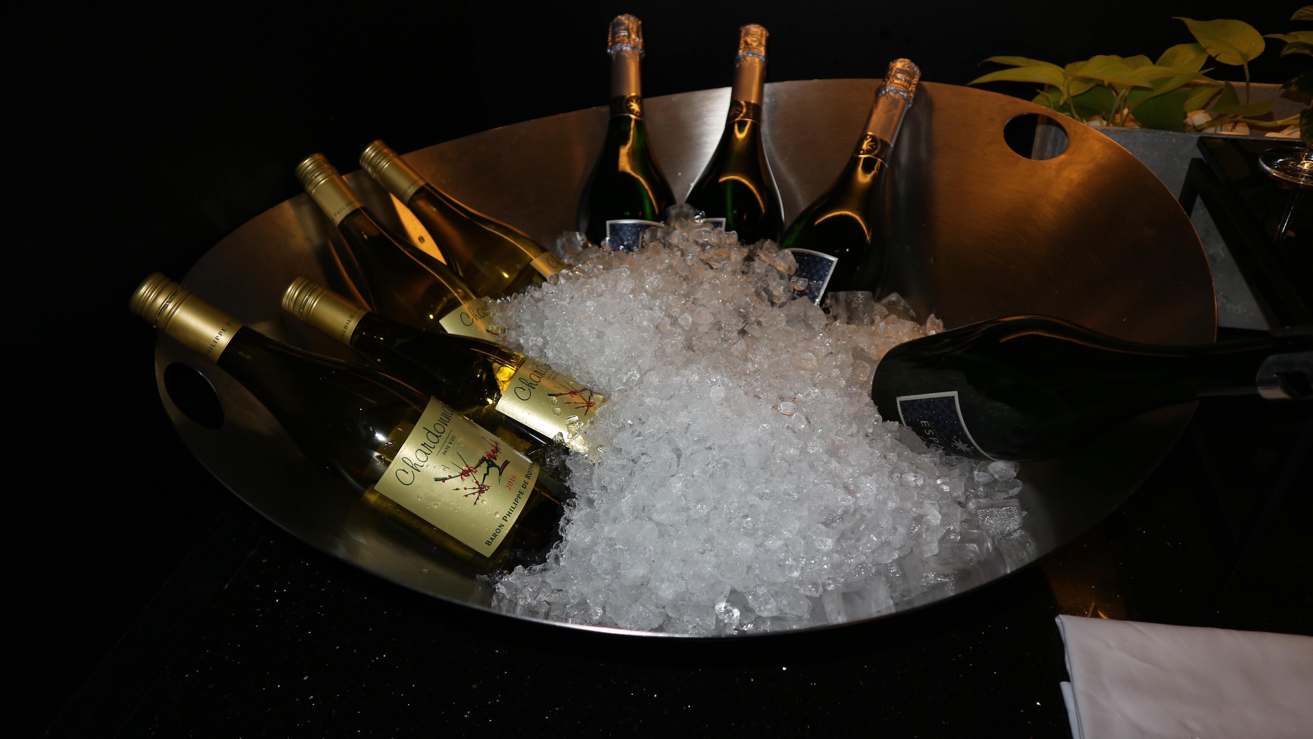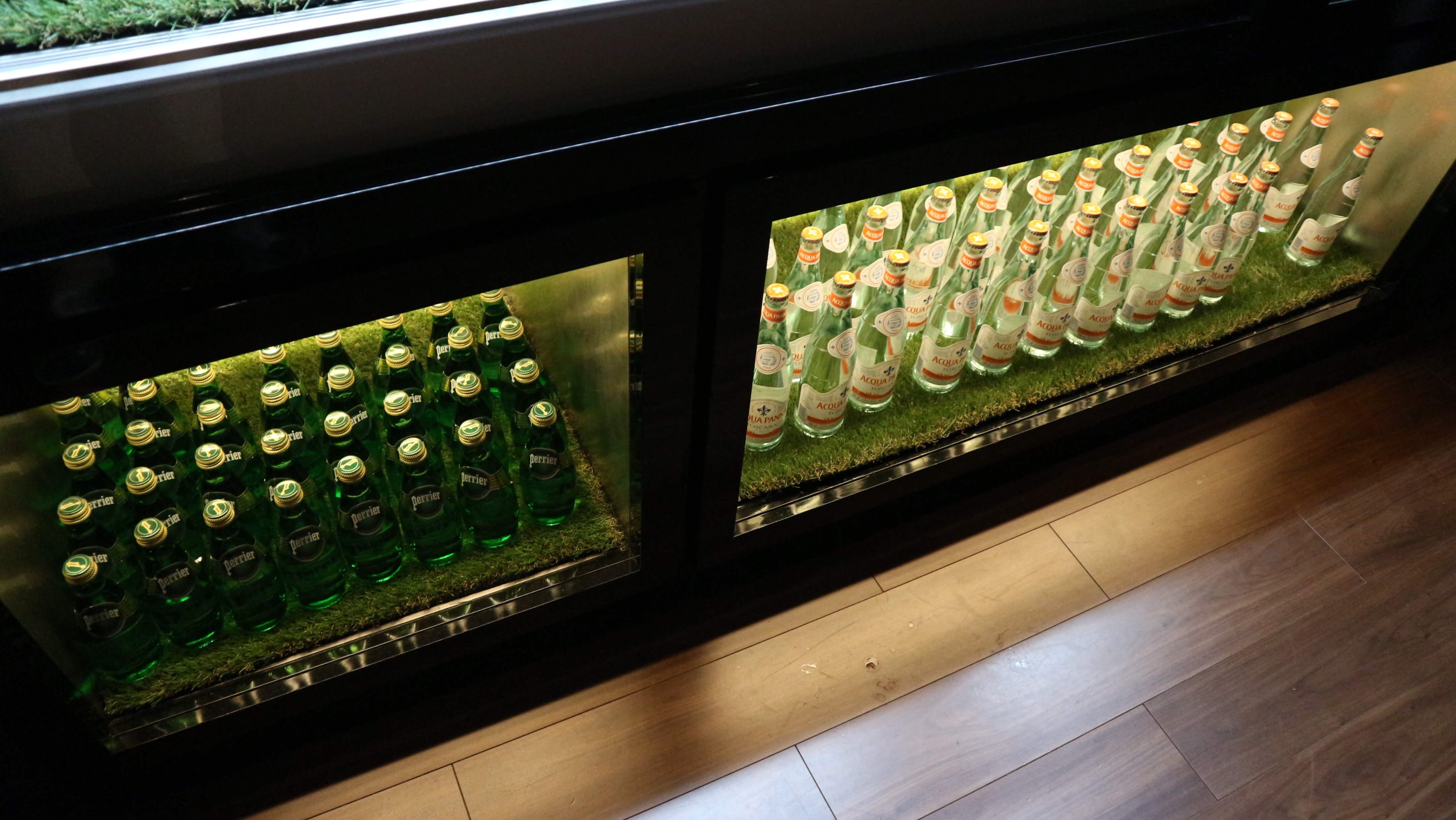 壁側の入り口とは反対側の下にはきれいにペリエやミネラルウォーターが並べられています。これだけ並ぶと圧巻です。