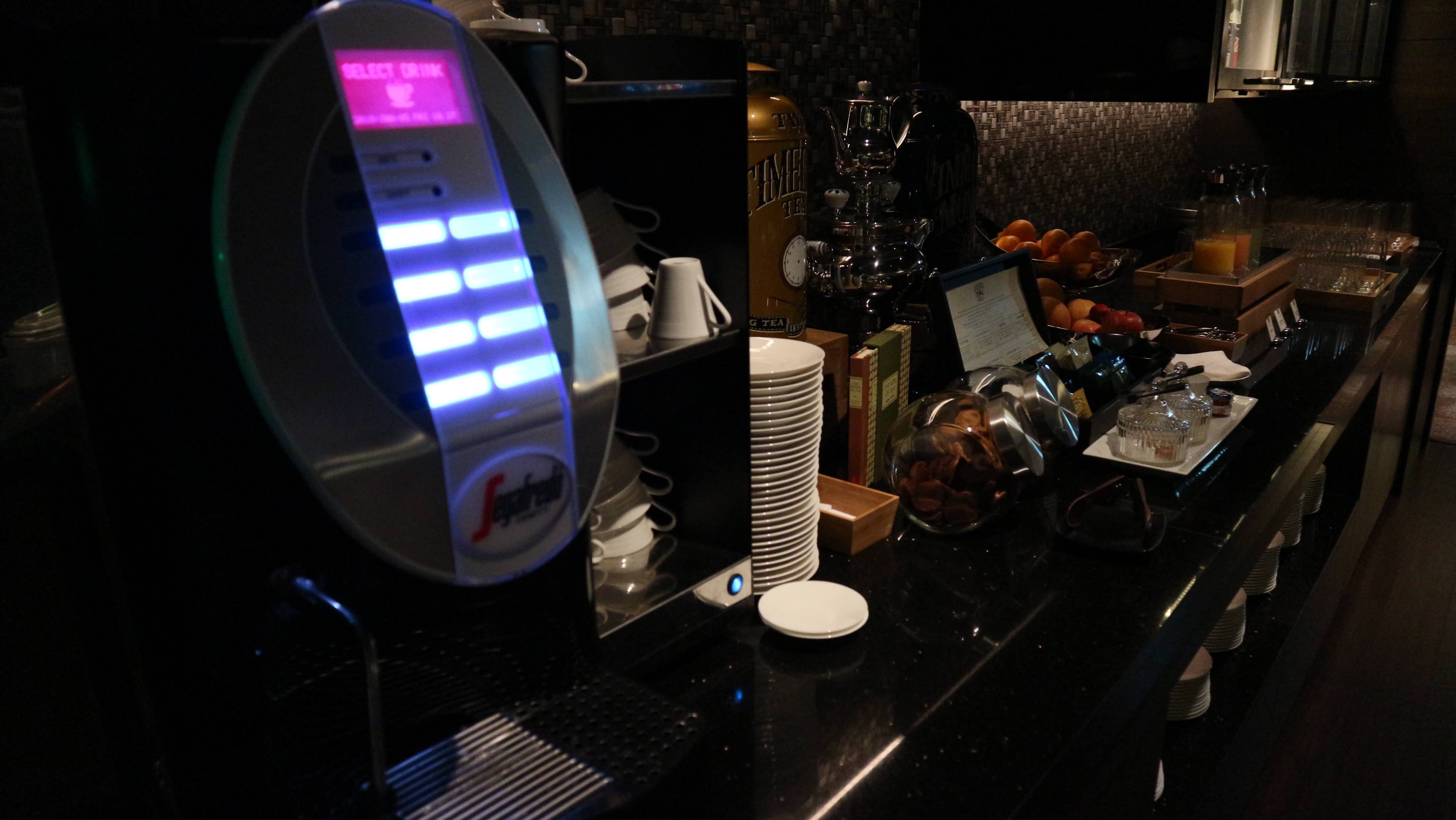 その下のカウンターにはコーヒーマシーン、TWGの紅茶、フレッシュジュースが並んでいます。クッキーなどの軽いお茶菓子もあります。