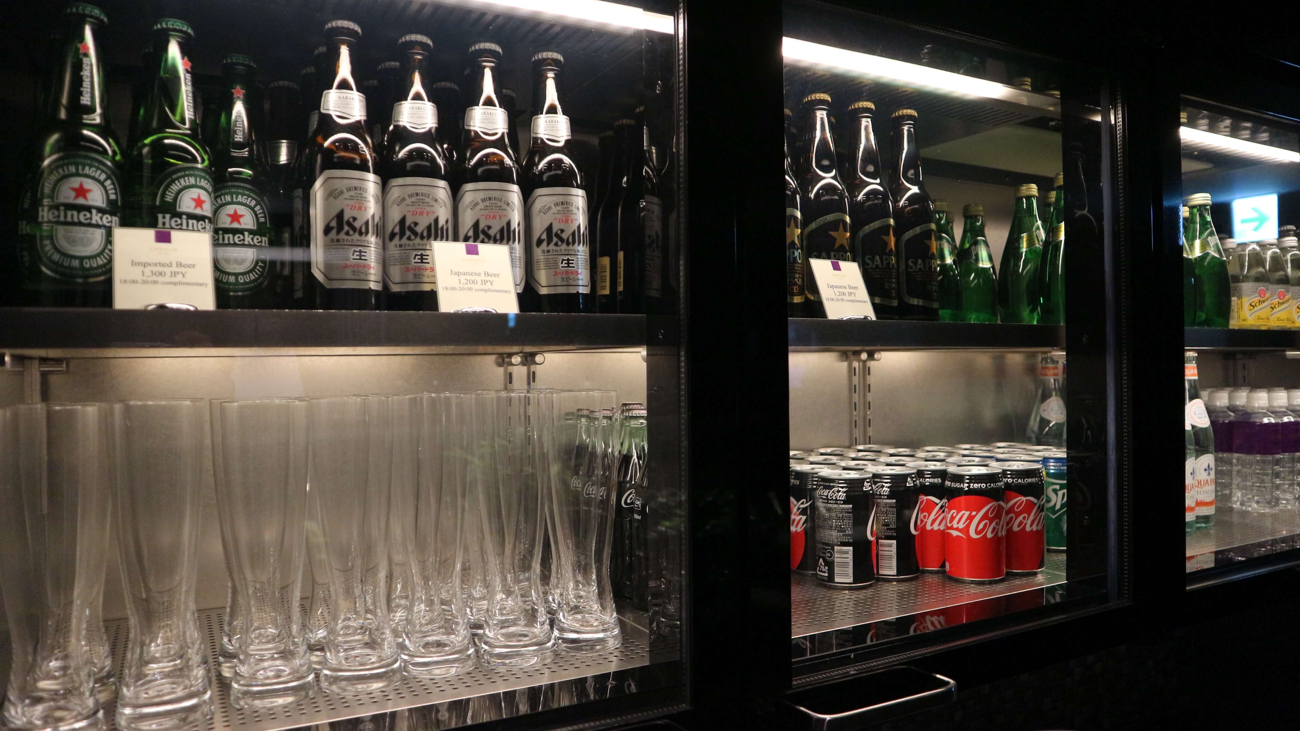 反対側(壁側)の冷蔵庫には瓶ビールが並んでいます。ハイネケン、アサヒ、サッポロと3銘柄ありました。値段が書いてあったのでビビりましたが、イブニングカクテル以外の時間は1200円払う必要があるようです。そしてコーラやペリエなどのソフトドリンクも並んでいます。