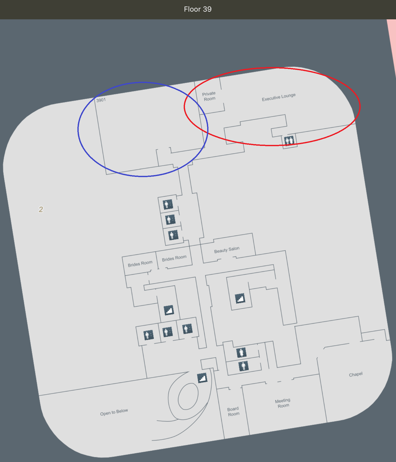 ちなみに下は39階のマップですが赤丸がエグゼクティブラウンジ、青丸が3901号室コンラッドスイートです。コンラッドスイートがいかに広いかがわかりますね~