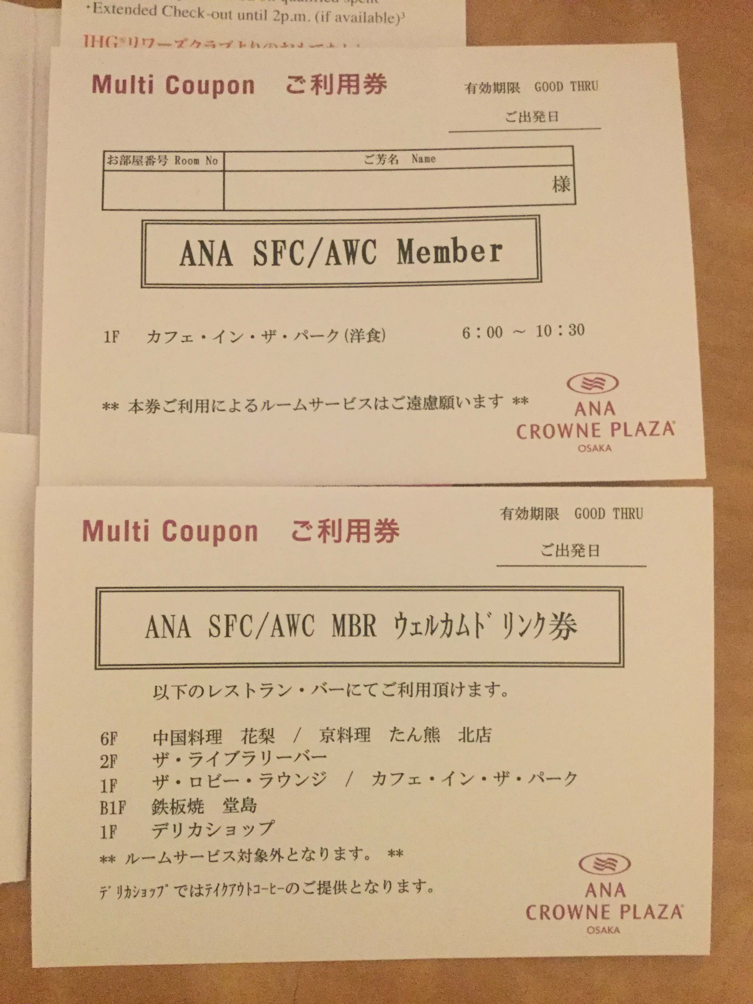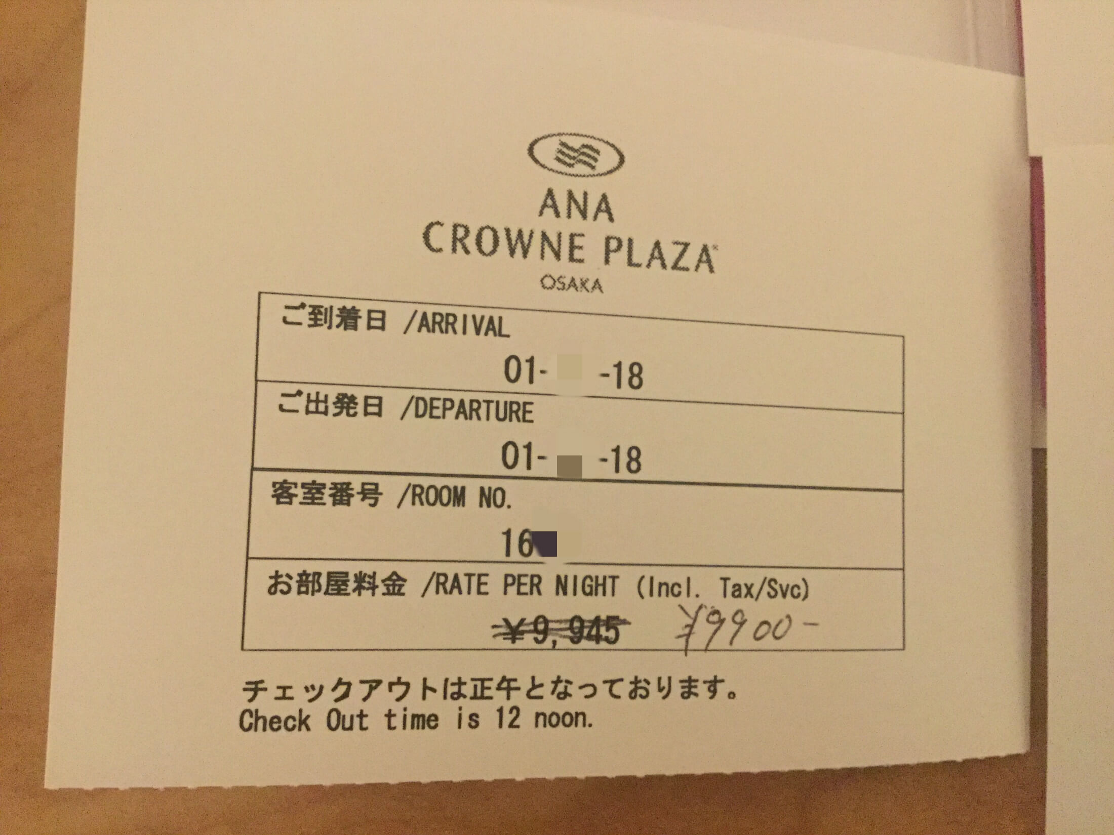 平日とは言えビジネスホテルでも10000円前後する最近の大阪でANAクラウンプラザホテルに9900円で宿泊出来てウエルカムドリンクと朝食を無料で頂くことができました!