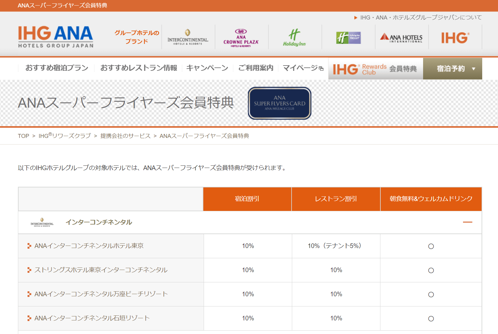 その他にもIHGというホテルグループにはSFC会員専用プランがあり宿泊料金割引や朝食無料といったサービスが受けられるのです。