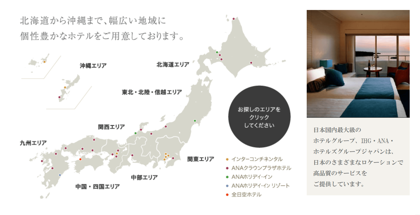 IHGと提携してANAがやっている日本国内限定の公式サイト です。日本国内のIHGホテルのみが予約可能です。公式サイトは以下のリンクからどうぞ!