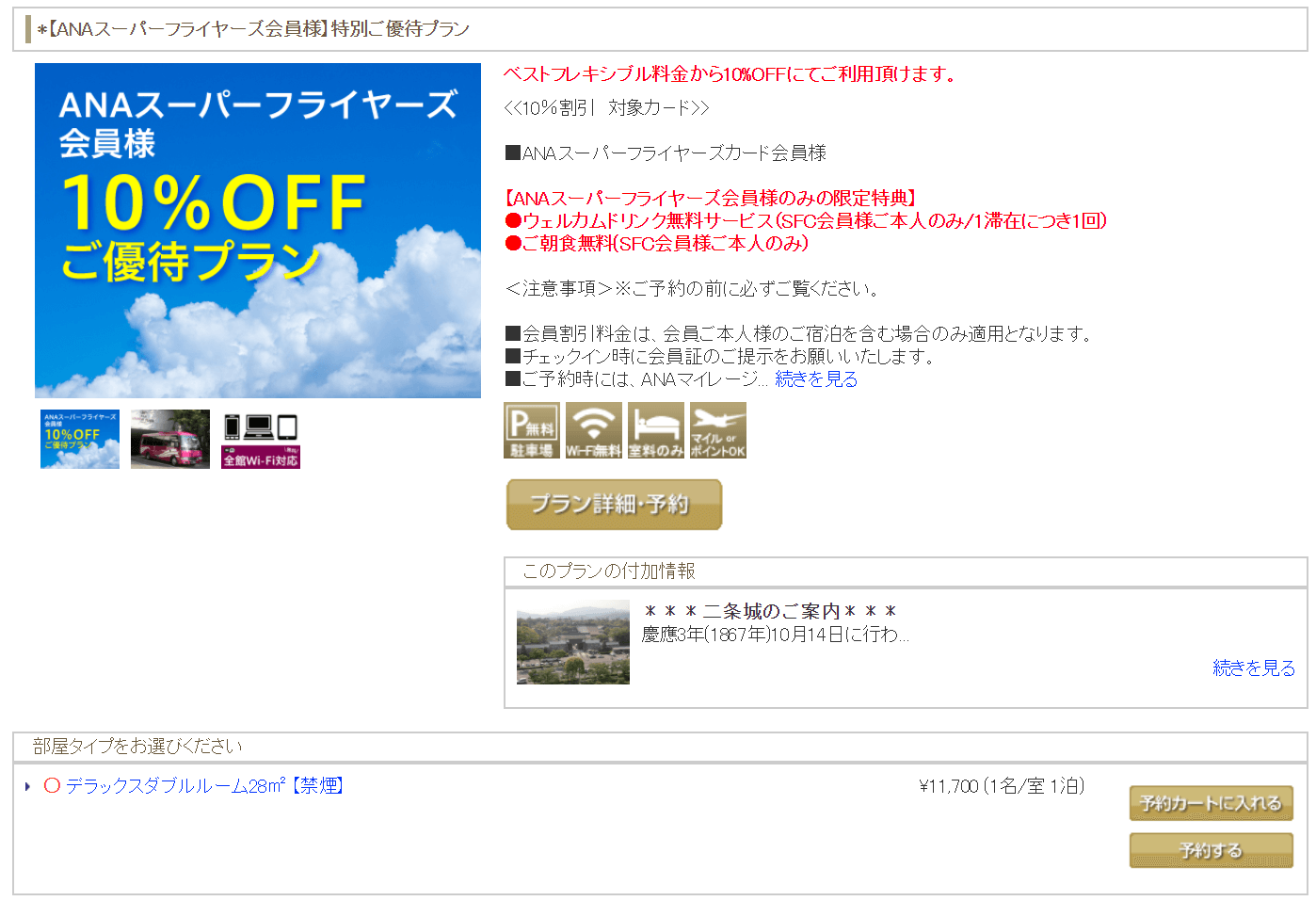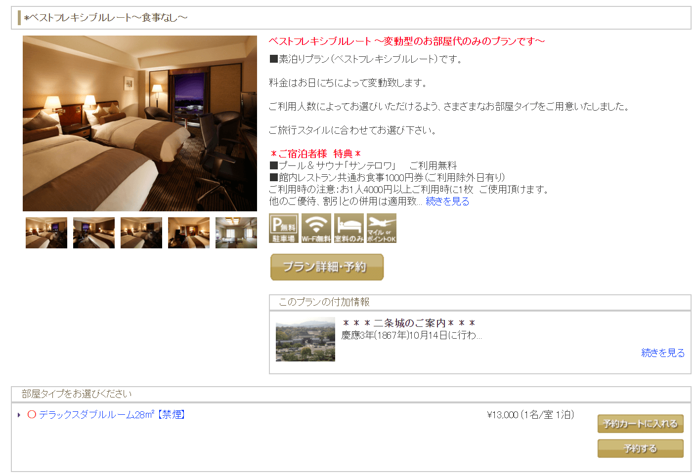 ちなみに同じ日のANAクラウンプラザホテル京都の同じ部屋のベストフレキシブルレートを調べてみると13000円ですのできちんと予約時に10%割引の値段で表示されていることが分かります。