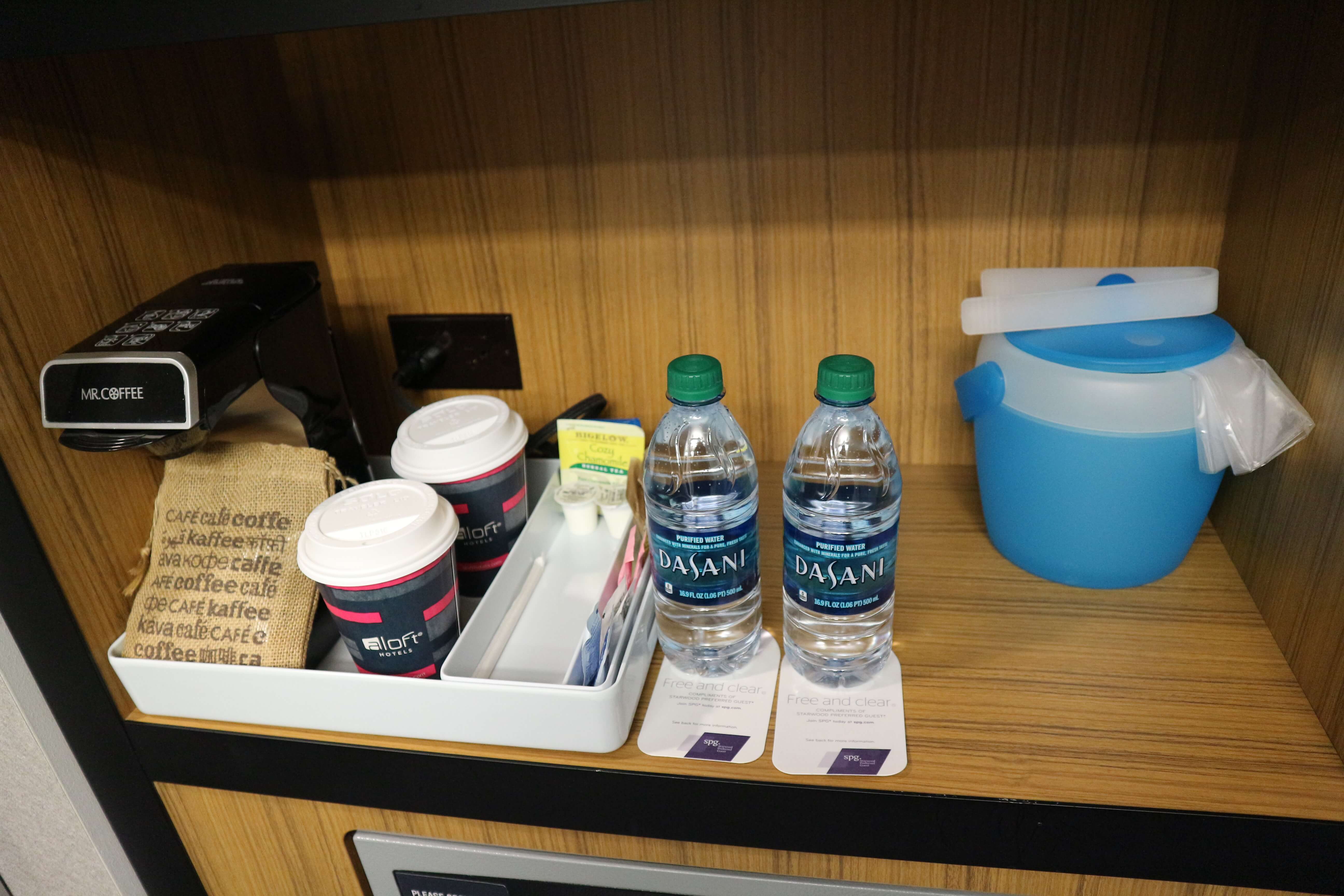そして水とコーヒーが置かれています。このミネラルウォーターは無料でした。かろうじてSPGゴールドの特典なのでしょうか?