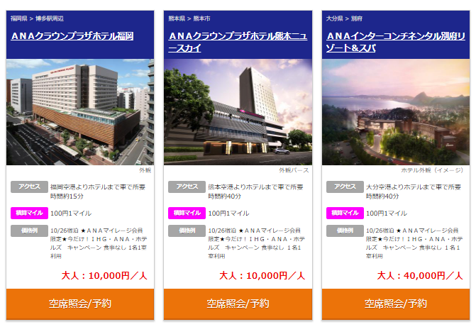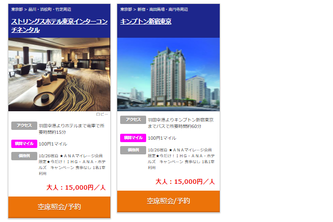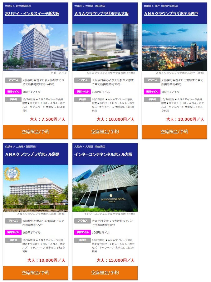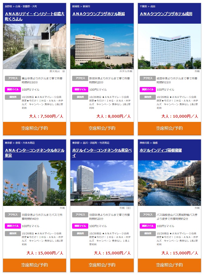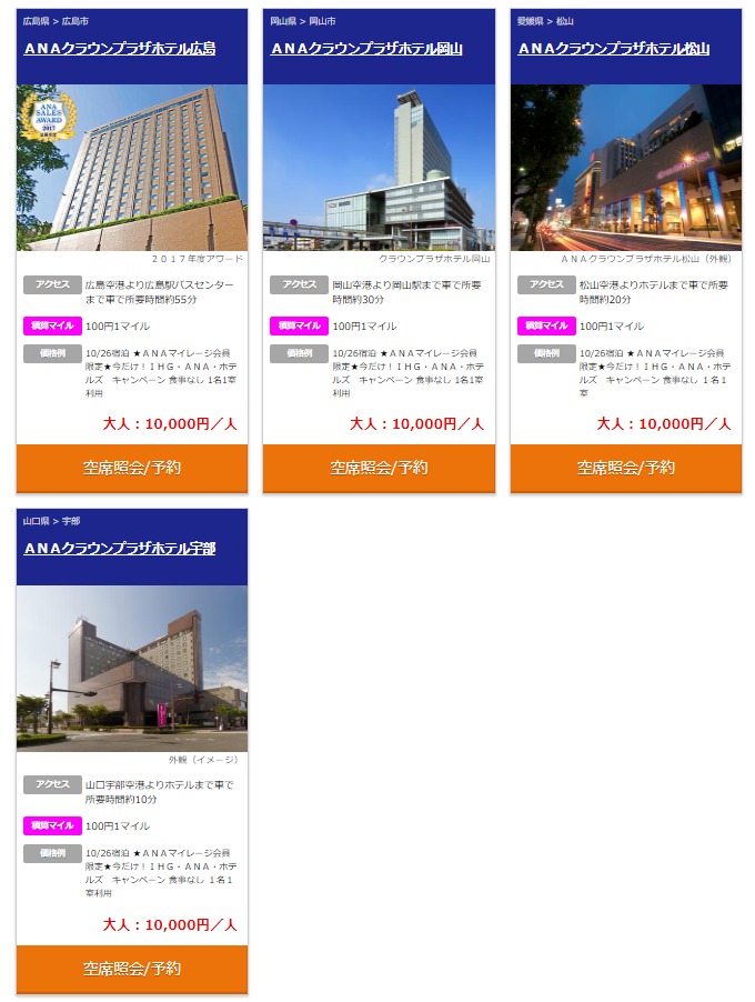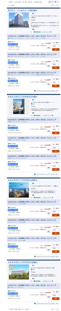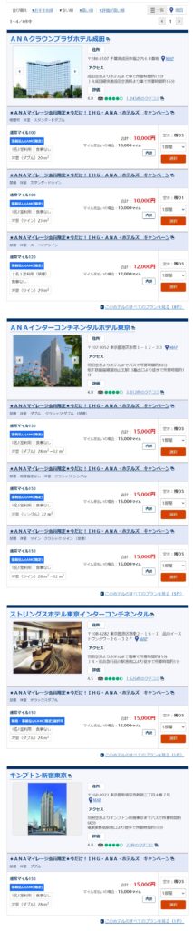 今回のANAマイレージクラブ会員限定IHGANAホテルズキャンペーンキャンペーンの対象ホテルの一覧を地域ごとにまとめています。また、ある平日の1名1泊時のキャンペーン料金とANAIHG公式ホームページの最安プランの料金を比較してみました。