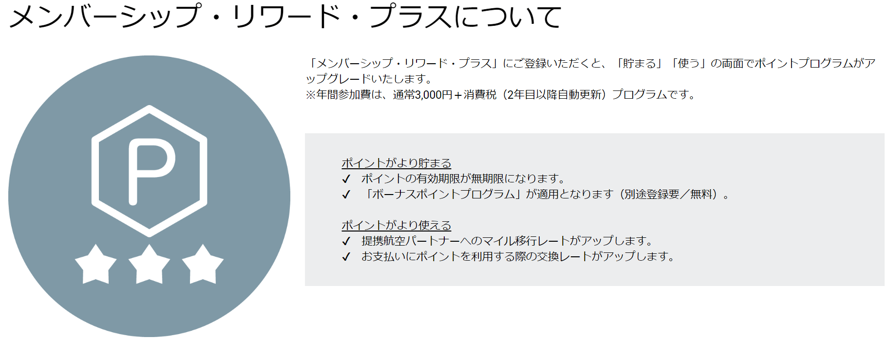 「メンバーシップ・リワード・プラス」は簡単に言うと、ポイント期限を無期限にしたり、ポイントからマイルへの交換率をアップさせるサービスです。