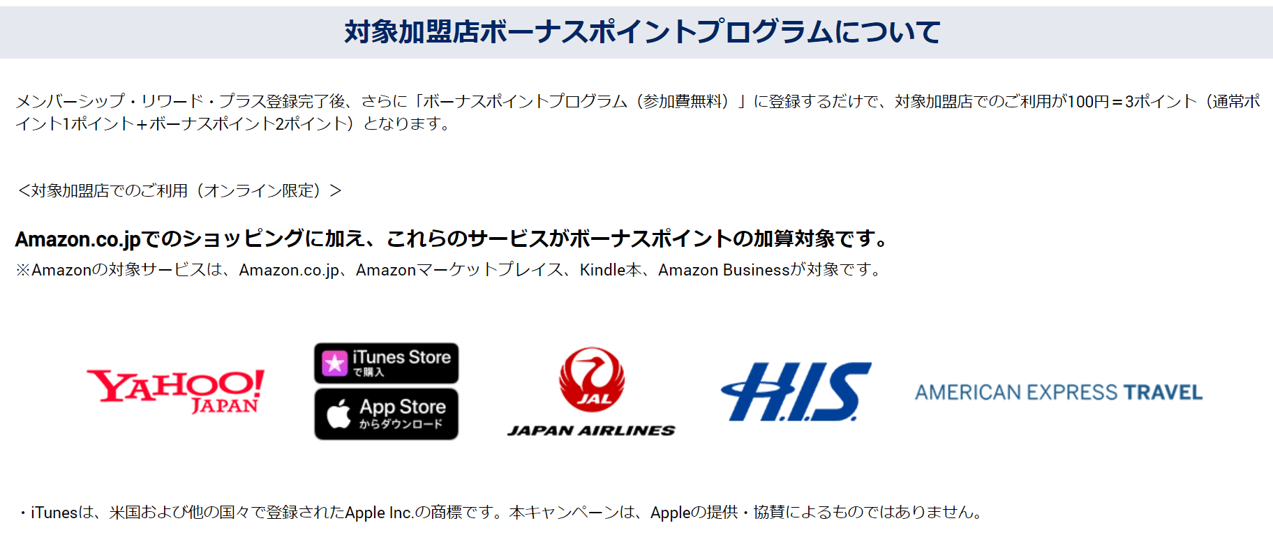 上述のようにこの「ボーナスポイントプログラム」は年会費3000円の「メンバーシップ・リワード・プラス」に加入していることが条件となります(アメックス・プラチナ、アメックス・ビジネス・プラチナ、アメックス・センチュリオン会員は無料)。