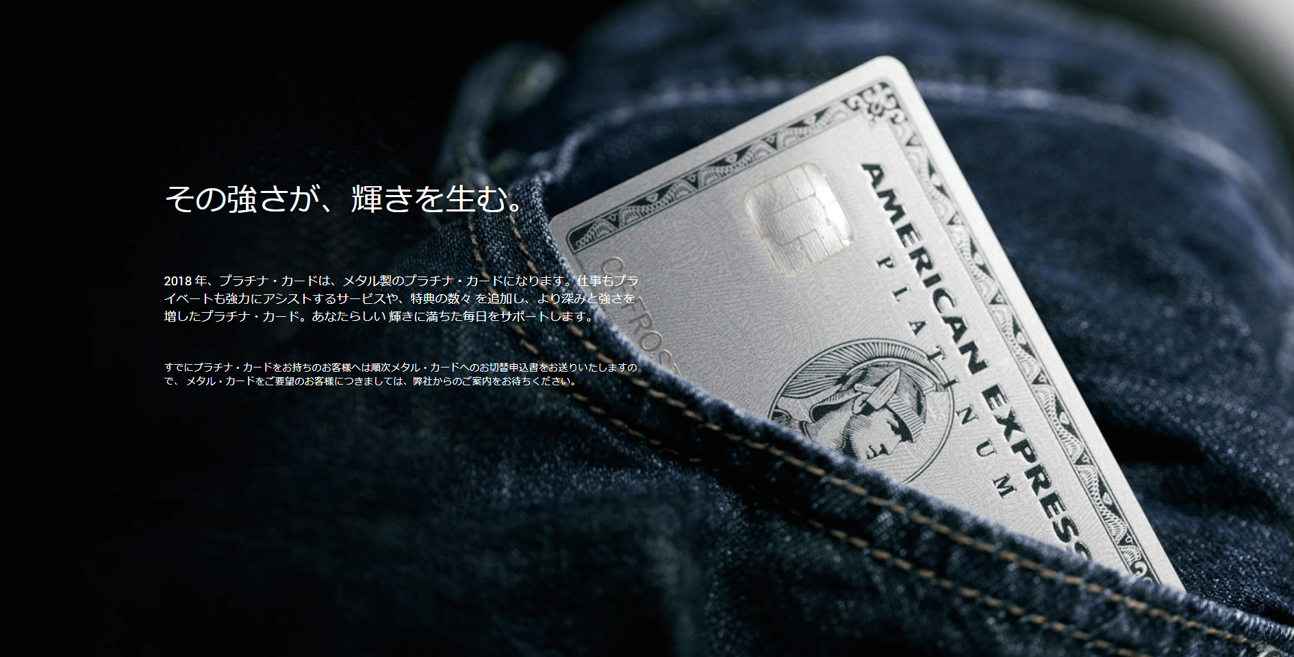 2018 年、プラチナ・カードは、メタル製のプラチナ・カードになります。仕事もプライベートも強力にアシストするサービスや、特典の数々 を追加し、より深みと強さを増したプラチナ・カード。あなたらしい 輝きに満ちた毎日をサポートします。