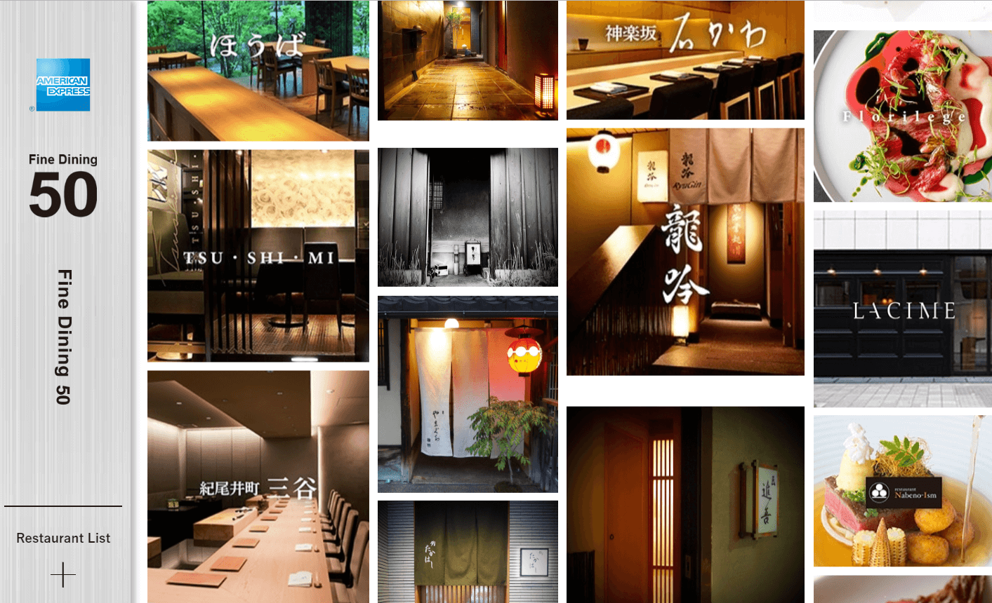 予約の取りにくい人気レストランを、年間約50店舗アメリカン・エキスプレスで貸し切り、特別メニューを楽しめるディナー会を開催するサービスです。