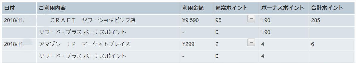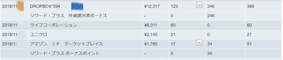 DROPBOXの年間使用料はドル建て決済ですので外貨建て決済ボーナスとして処理されています。またヤフーショッピングもAmazonもリワードプラスボーナスポイントとして処理されています。Amazonはマーケットプレイスでの買い物もきちんとボーナスポイントが付与されています。いずれも100円=2ポイントが加算され、通常ポイントと合わせ100円=3ポイントが加算されています!