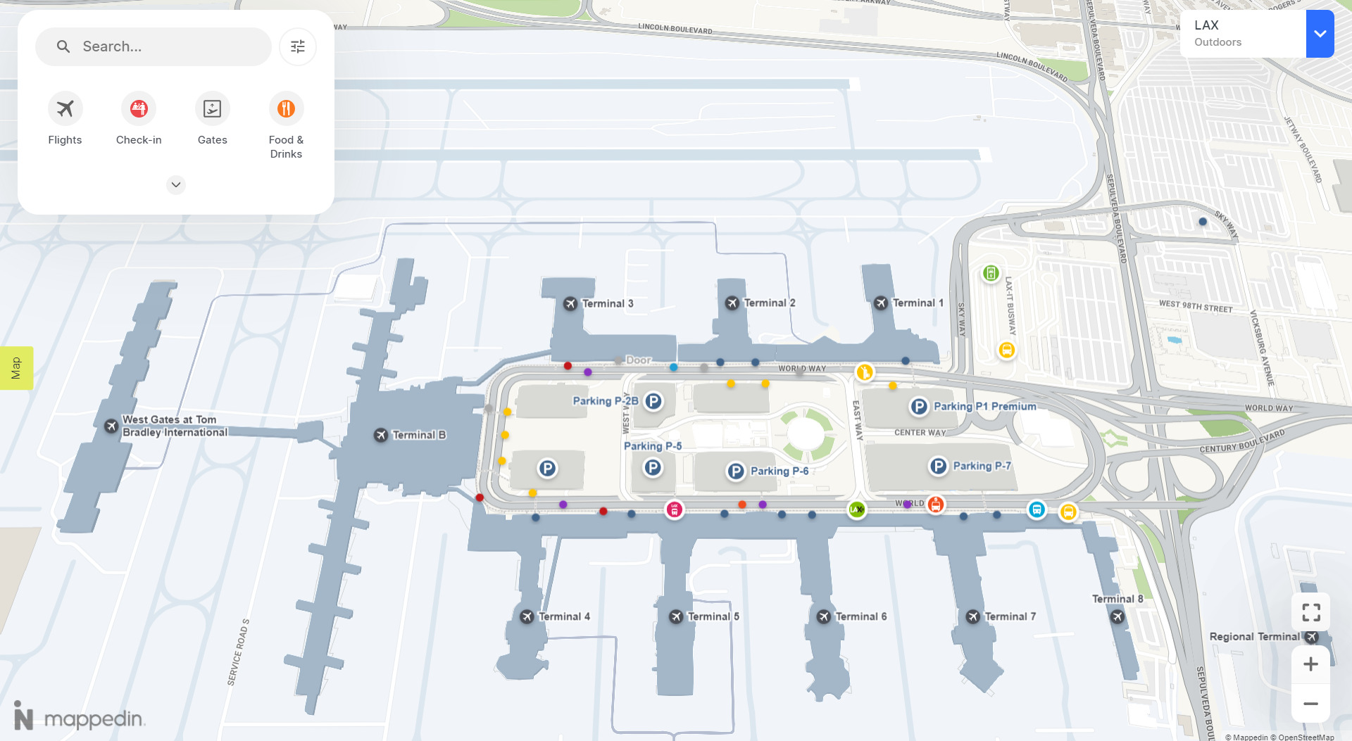 ロサンゼルス国際空港のアメックスセンチュリオンラウンジは、全部で9つあるターミナルのうち「Bターミナル」と呼ばれるトム・ブラッドレー・インターナショナル・ターミナル(Tom Bradley International Terminal:TBIT)にあります。このターミナルはロサンゼルス国際空港で最も大きなターミナルで、主に国際線が発着するターミナルとなり、日本発着の場合はこのTBITを利用する場合がほとんどとなります。