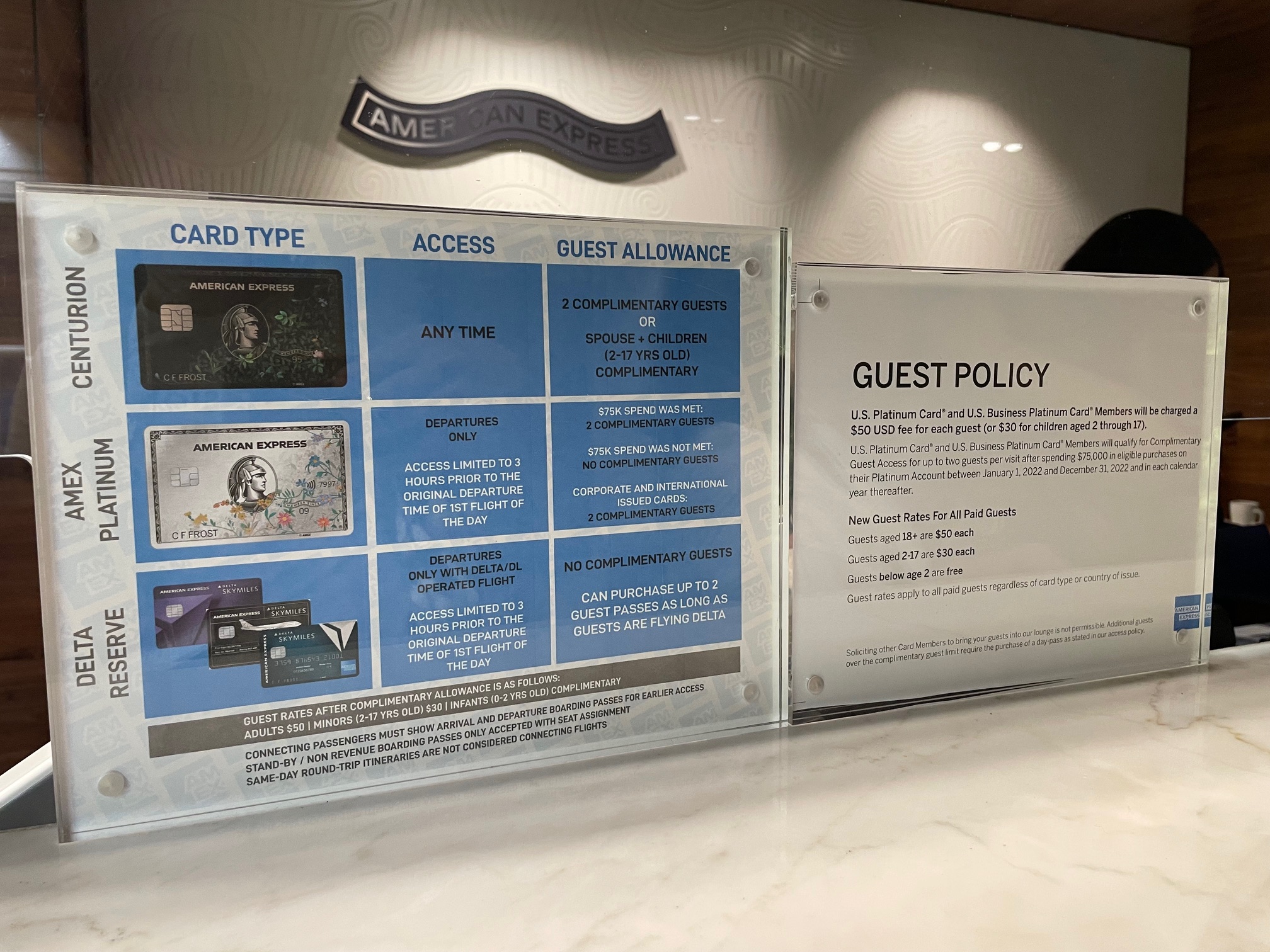 レセプションに上の画像のようにプラチナカードは$75,000/年の支払いがないと同伴者有料という表記を見てドキッとしましたが、日本発行のアメックスプラチナではこの条件は当てはまらず、無条件で同伴者2名までOKと入口のスタッフの方が仰っていました。