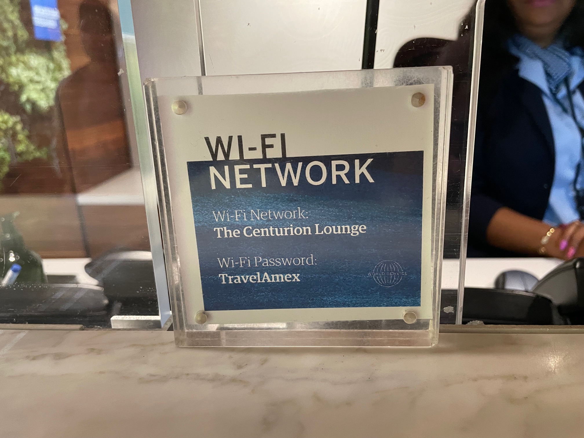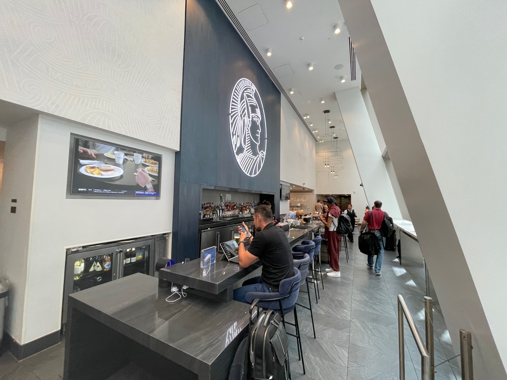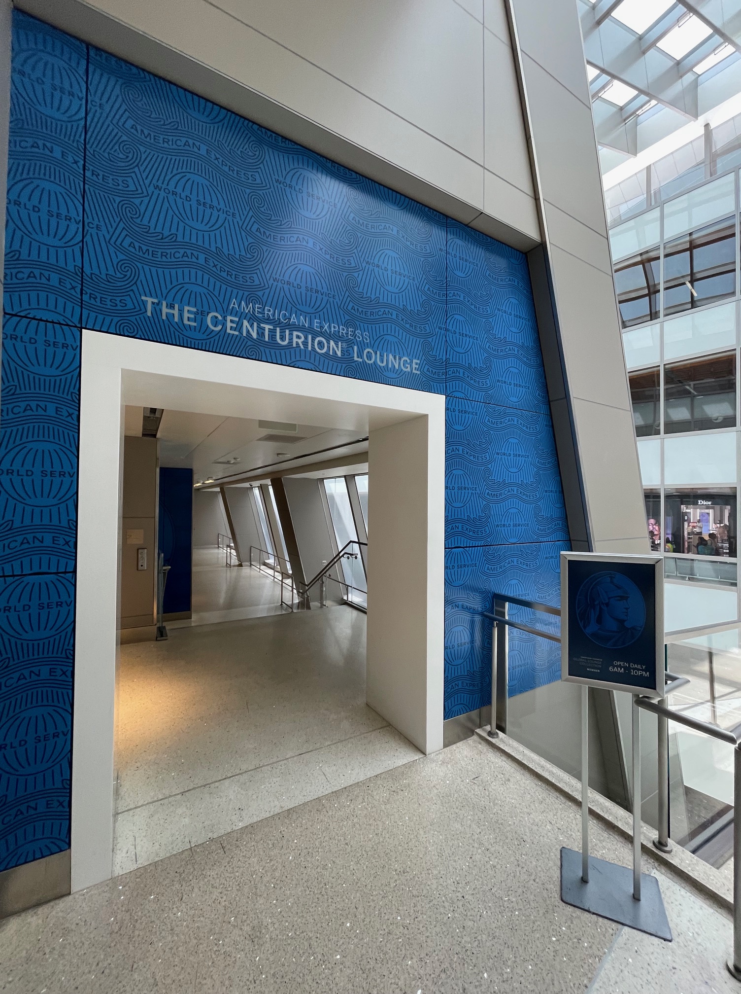アメックスセンチュリオンラウンジは4階のTSAチェックポイントを過ぎてすぐの場所にあります。3階でチェックインをした後、エスカレーターで4階に上がり、セキュリティーチェックを通過してすぐ左側を見ると、アメリカンエキスプレスのマークが目立つのですぐわかります。