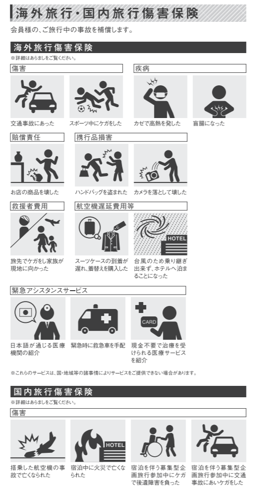 海外旅行傷害保険は最高1億円まで、国内旅行傷害保険は最高5,000万円まで補償されます。しかも、海外旅行保険は自動付帯です。自動付帯とは、クレジットカードで旅行代金を支払わなくても、カードを持っているだけで日本出国日から自動的に海外旅行保険が適用されるサービスで、大変ありがたい保険となっています。