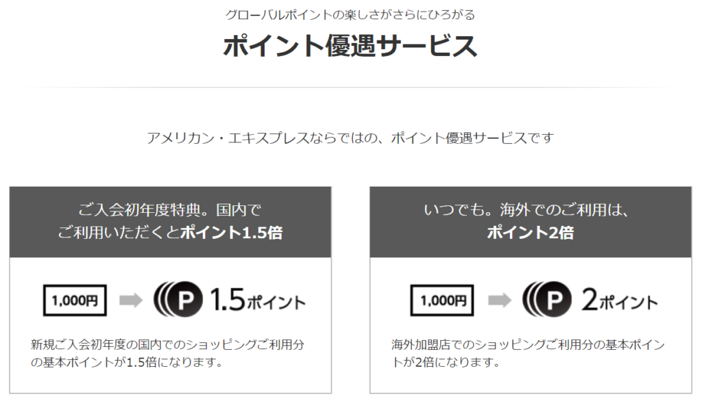 ポイント優遇サービス(海外利用ポイント2倍、初年度国内利用ポイント1.5倍)