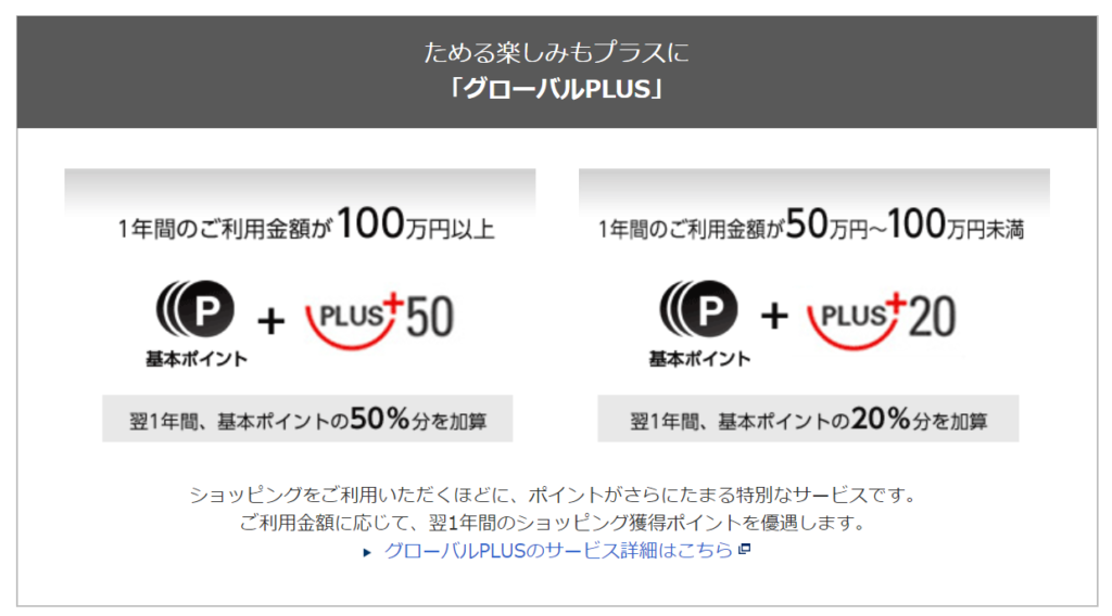 これだけでは還元率は低いのですが上記のグローバルPLUSやプレミアムスタープログラムなどでボーナスポイントを稼ぐと還元率を大幅に上げることが可能です。