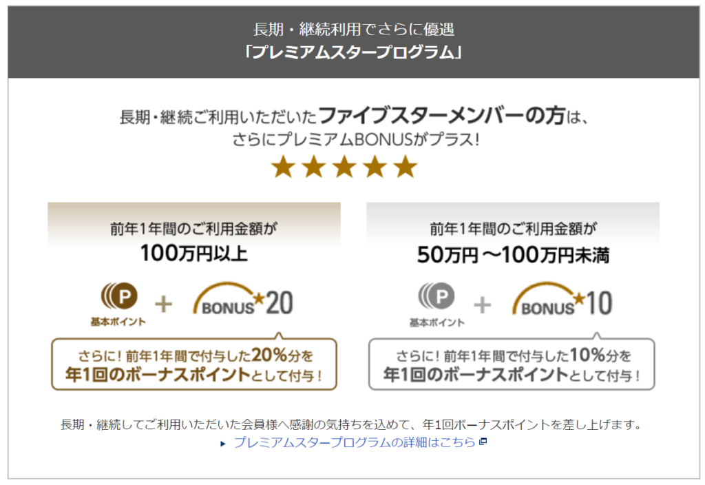 この★が5つ貯まると、「ファイブスターメンバー」になることができます。前年1年間の利用金額が100万円以上の場合、前年に獲得した基本ポイントの20%分をボーナスポイントとして獲得できます。また、前年1年間の利用金額が50万円以上100万円未満の場合、前年に獲得した基本ポイントの10%分をボーナスポイントとして獲得できます。