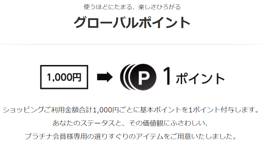 「グローバルポイント」というポイントプログラムでは、基本的に月額1000円の利用につき1ポイントが付与されます。1ポイントは5円相当となり、ポイントの有効期限は獲得月から3年です。