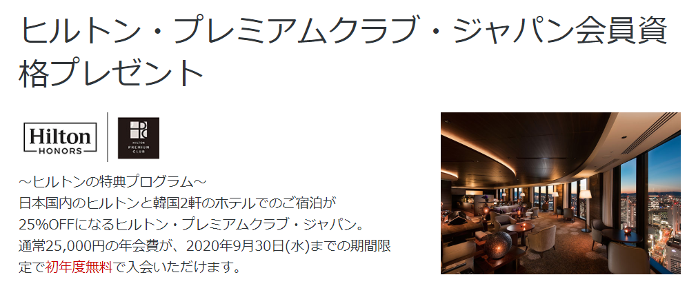 日本国内全てと韓国の一部のヒルトンホテルでの宿泊が25%OFFになるヒルトン・プレミアムクラブ・ジャパン(HPCJ)は通常25,000円の年会費がかかりますが無料で入会することができます。ヒルトンによく宿泊される方にはお勧めです!