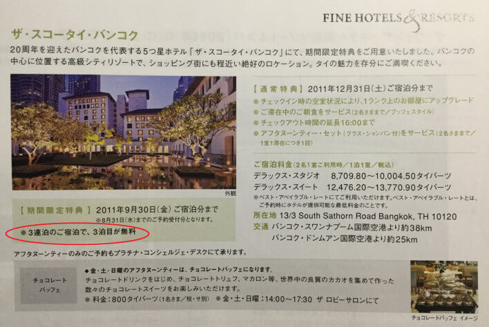 左下赤丸の部分に「3連泊で3泊目無料」という記載がありますが右側のようにレイトチェックアウトやアップグレード、朝食など通常のFHRの特典もついています。