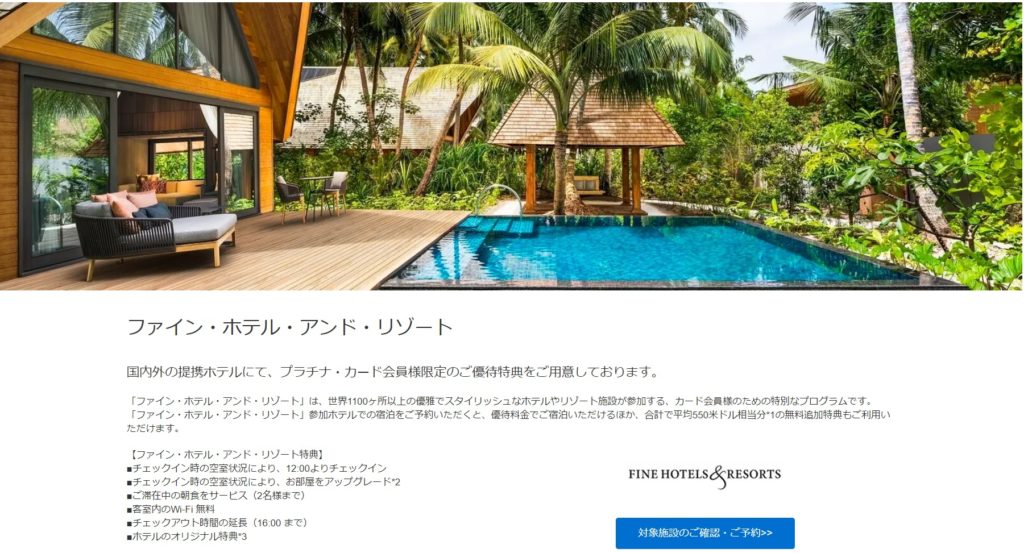・本特典はプラチナ・コンシェルジェ・デスクまたは専用サイトおよびアメリカン・エキスプレス・トラベル オンラインを通して、ファイン・ホテル・アンド・リゾートを新規にご予約いただいた場合に適用されます。また日本で発行されたプラチナ・カード会員様がご本人のお名前でご予約いただき、プラチナ・カードにてお支払いいただいた場合にご利用いただけます。