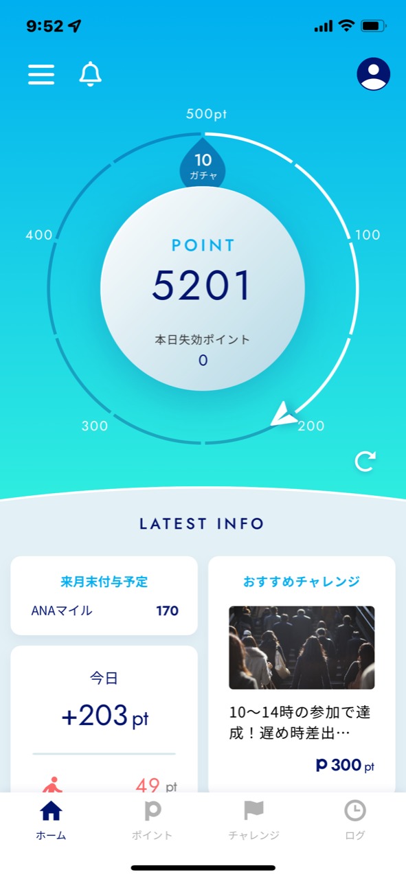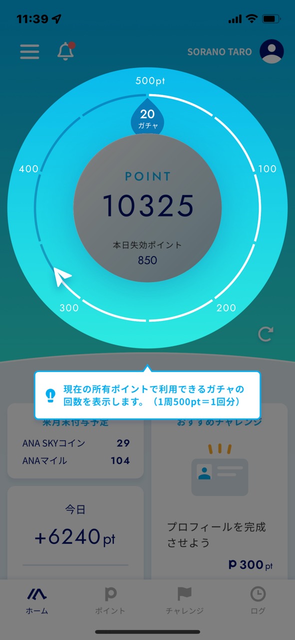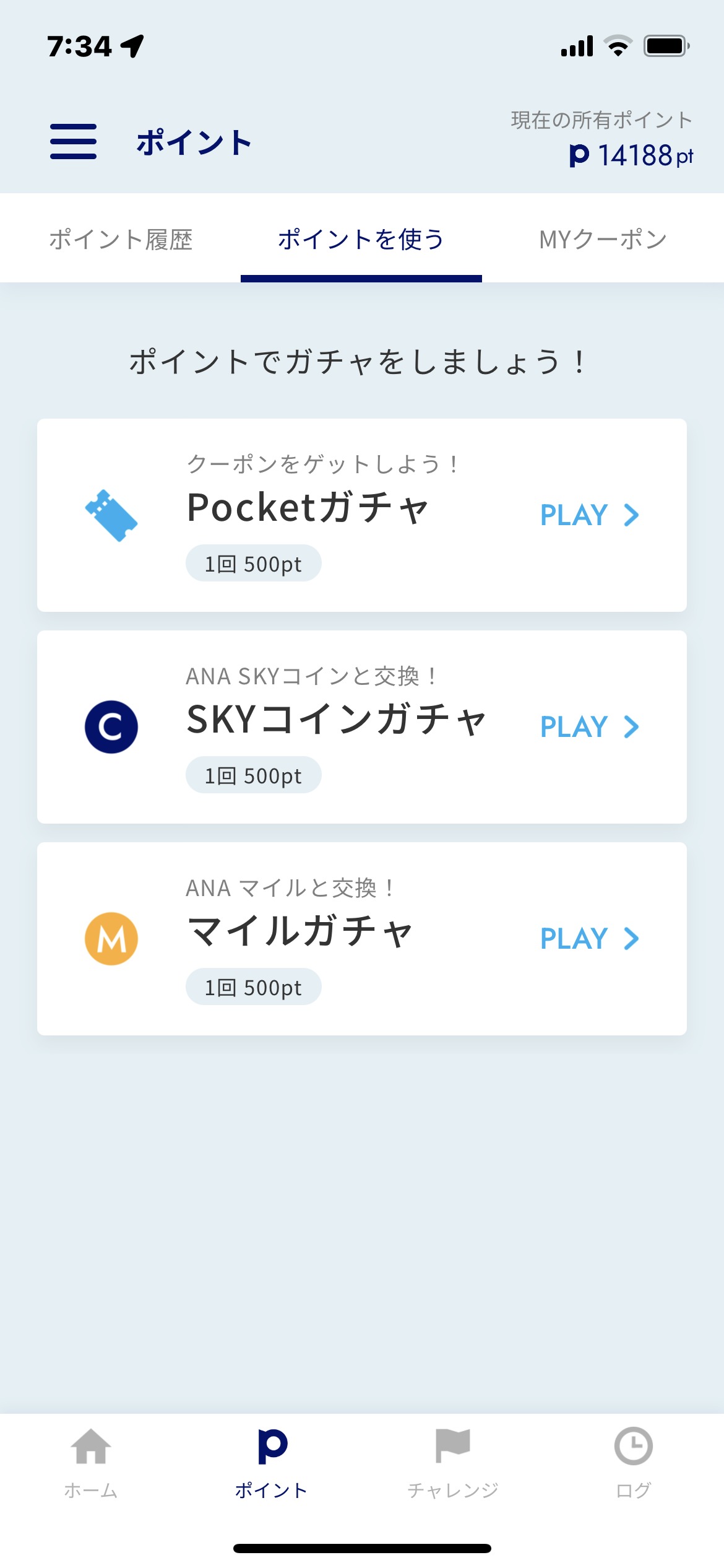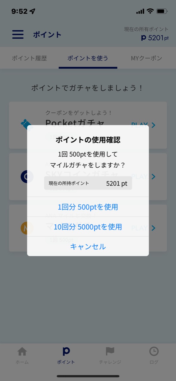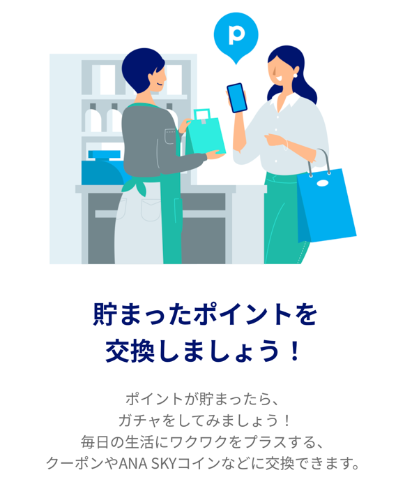 貯まった500ポイントを使ってガチャと呼ばれるクジをひき「クーポン」「ANAスカイコイン」「ANAマイル」などと交換することができるサービスになっています。