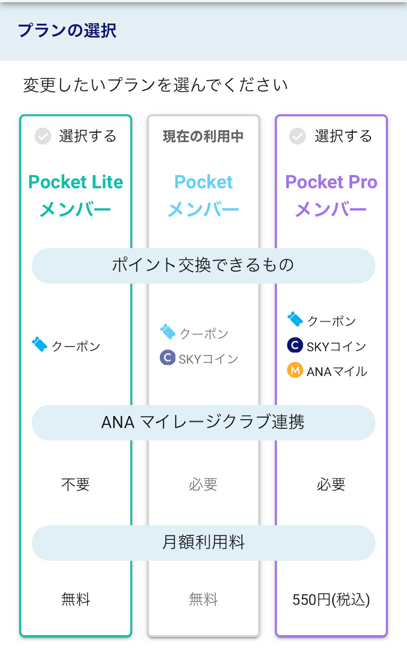 ANA Pocket Lite、ANA Pocketは無料だがANA Pocket Proは550円の月会費が必要となります
