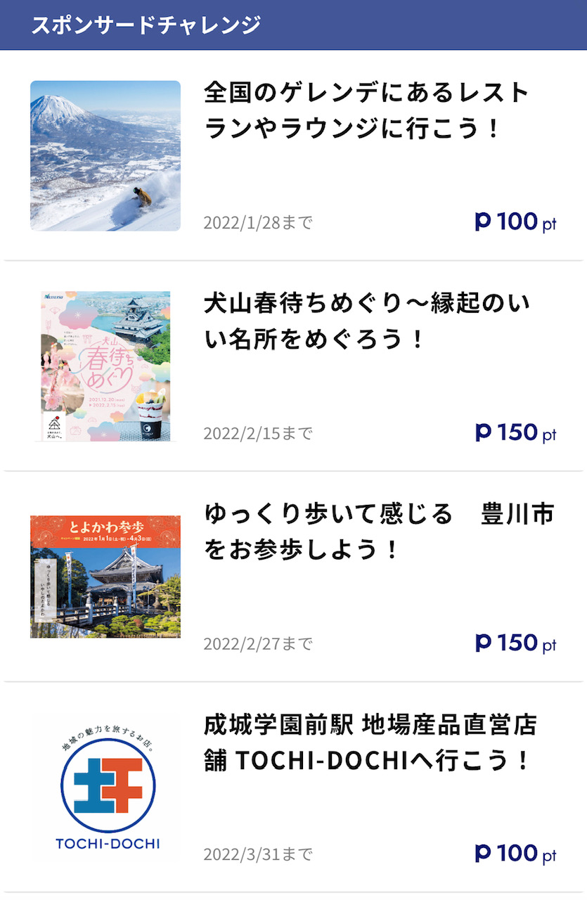 日頃のちょっとした移動でクリアできるチャレンジやスポンサードチャレンジの内容はこんな感じです