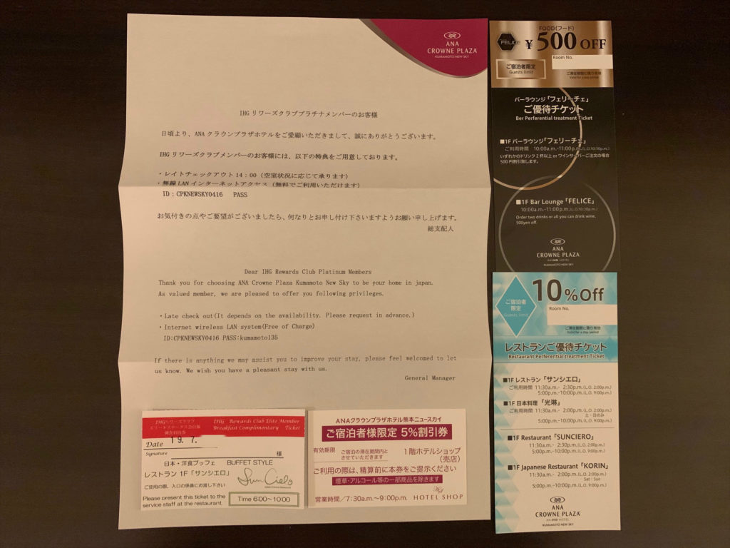 チェックイン時に朝食券、バーラウンジ500円割引券、レストラン10%割引券、ホテルショップ5%割引券を頂きました!これはIHGリワーズクラブ会員特典なのか皆さん貰えるものなのかは分かりませんでした