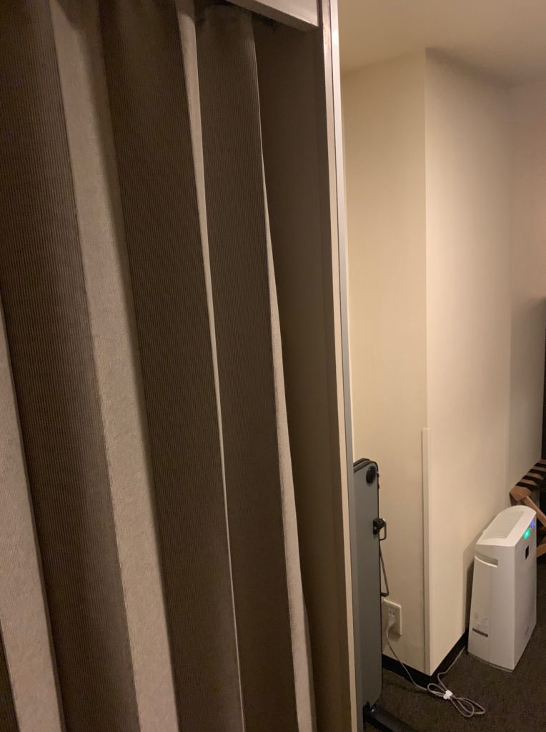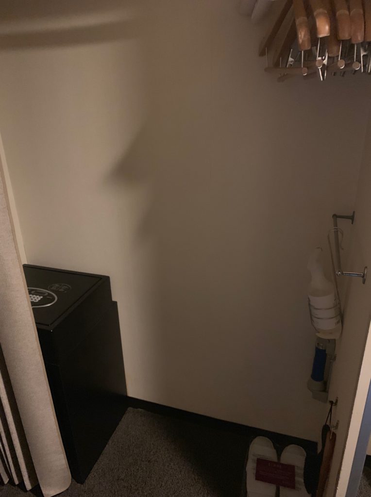 開けてみるとクローゼットとなっておりセーフティボックス、スリッパがあります。シティホテルでカーテンで仕切るクローゼットはあまり見かけずちょっとびっくりしました。