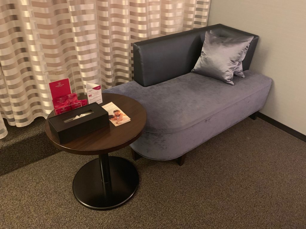 テーブルの上にはANAクラウンプラザホテルおなじみのアイウォーマー、入浴剤、お茶などの「スリープ・アドバンテージ」と呼ばれる快眠グッズ